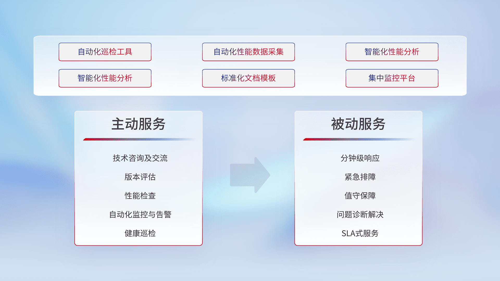 智能化工具和标准化文档,,保障服务质量,,,,提供主动服务(包含技术咨询、、、版本评估、、、、性能检查、、自动化监控与告警、、、健康巡检)和被动服务包含(分钟级响应、、紧急排障、、、值守保障、、问题诊断解决、、、SLA服务)。。